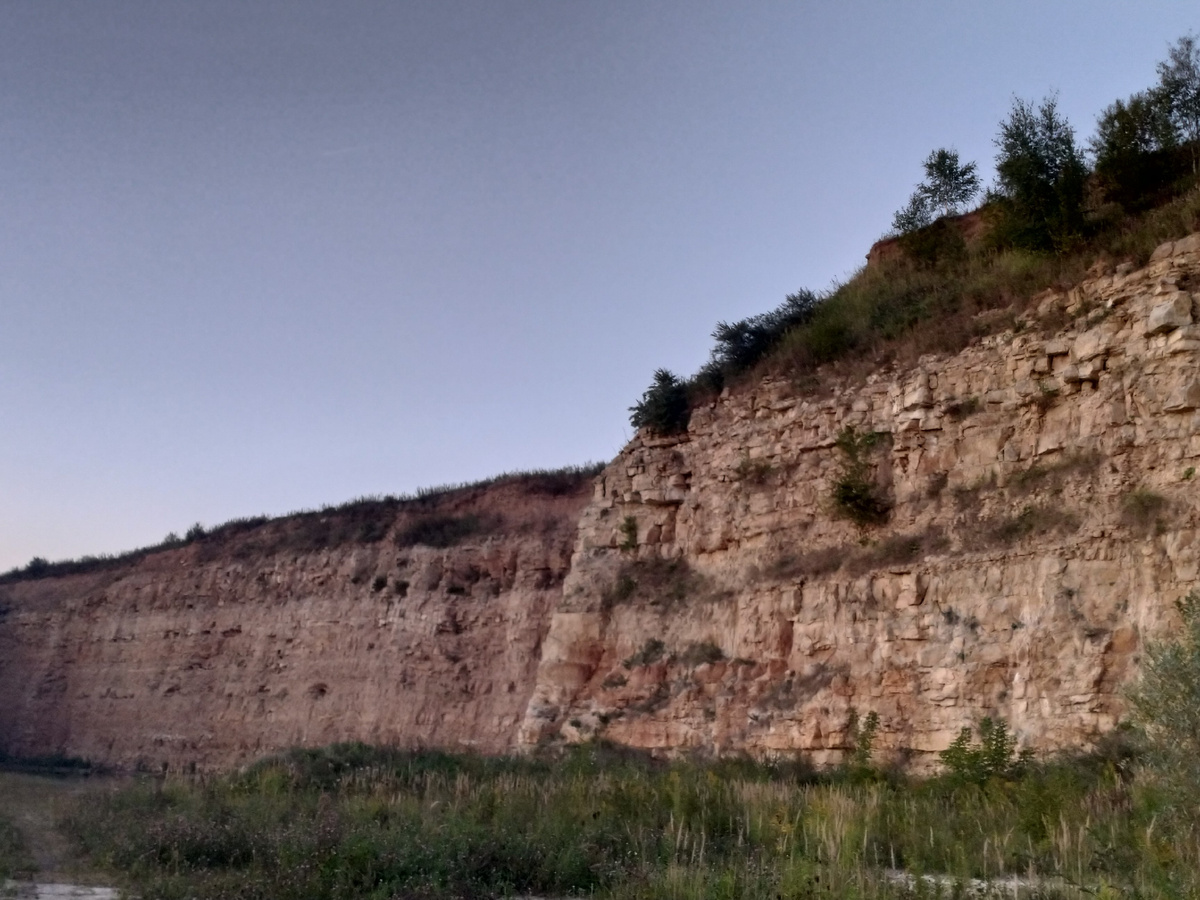 В Подмосковном Домодедово есть малоизвестное, но очень интересное место с загадочным названием Стратотип Московского яруса. Если простыми словами, стратотип — это обнажение горных пород, являющееся эталонным разрезом стратиграфического подразделения. В данном случае это осадочные породы каменноугольного периода палеозойской эры, которым более 300млн лет. Это место является особо охраняемой природной территорией и геологическим памятником России, имеет огромную ценность для науки. Стратотип находится на территории действующего известнякового карьера Рыбушкин овраг и имеет рукотворное происхождение. В общем я туда съездил, посмотрел, сейчас всё расскажу. От деревни Киселиха тропинка через поле приводит прямо к карьеру. С самого края отвесной стены открывается шикарный вид, но вниз смотреть страшновато - высота большая. Чтобы спуститься в карьер, по тропинке нужно повернуть направо и пройти через заросли облепихи. Там будет первый спуск к восточной стене. Если пройти по тропинке дальше -