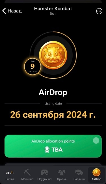Свой airdrop Хомяк (Hamster Kombat) проведет уже в сентябре 2024-го: это событие игроки давно ждут и отрабатывают активности, необходимые для получения раздачи. Airdro (раздачи токенов) подобным играм нужны для того, чтобы привлечь к своему проекту как можно больше внимания и вознаградить за активность ранних пользователей. Свой airdrop Хомяк (Hamster Kombat) проведет уже в сентябре 2024-го: это событие игроки давно ждут и отрабатывают активности, необходимые для получения раздачи. Airdro (раздачи токенов) подобным играм нужны для того, чтобы привлечь к своему проекту как можно больше внимания и вознаградить за активность ранних пользователей. Дату эирдропа объявили 13 сентября, он состоится 26-го, но конкретное время разработчики игры не называют. В этот день в профиле игрока должны появиться очки Airdrop Allocation Points, в соответствии с которыми ему начислят монетки HMSTR. Особых условий для участия в дропе нет: на него смогут претендовать все действующие игроки. Но его размер буд