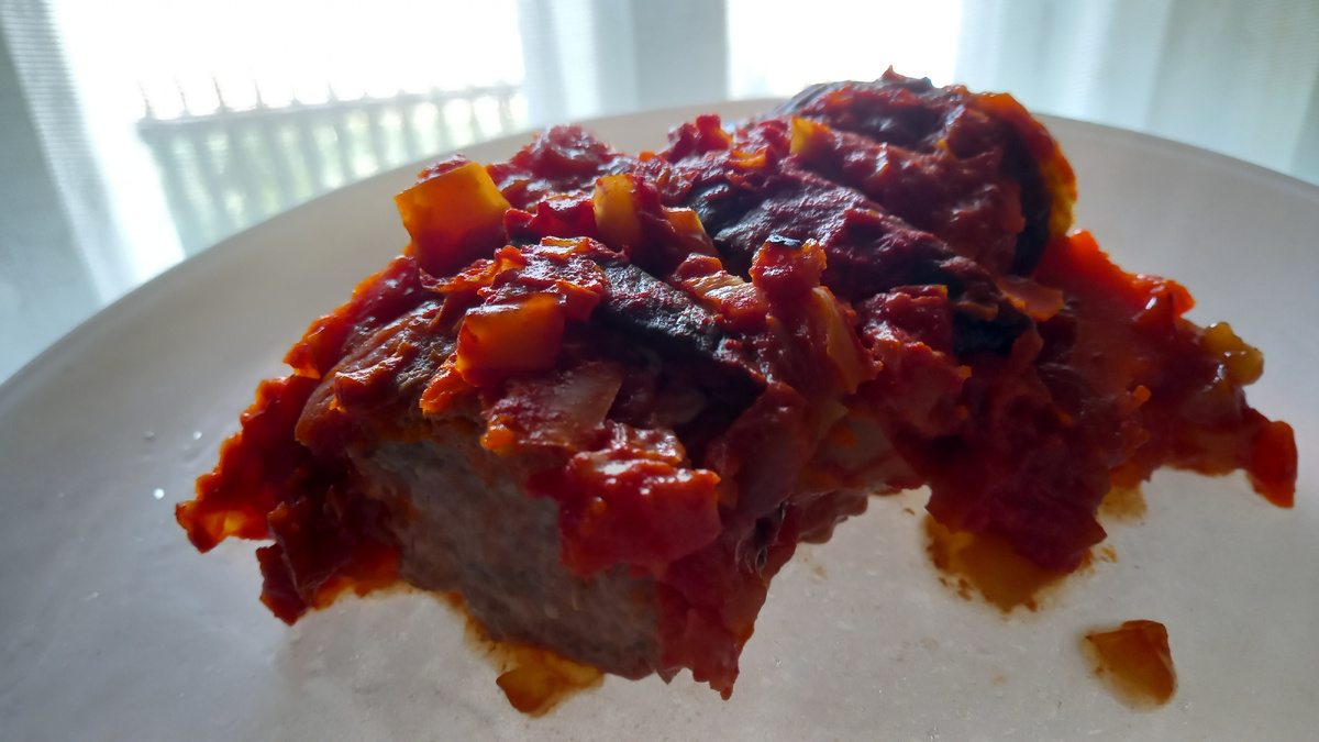 Режем кружочками баклажаны, выкладываем их в миску, солим. Оставляем на 30 минут. В фарш добавляем нарезанный мелко репчатый лук, соль, черный перец. Из фарша делаем небольшие плоские котлетки по форме баклажан. В форму для запекания выкладываем в виде колбаски кружок баклажана, затем кружок фарша и т.д. Заливка: жарим на сковороде нарезанный мелко красный перец, репчатый лук, добавляем томатную пасту. Заливаем смесью фарш с баклажанами. Ставим в духовку до готовности.