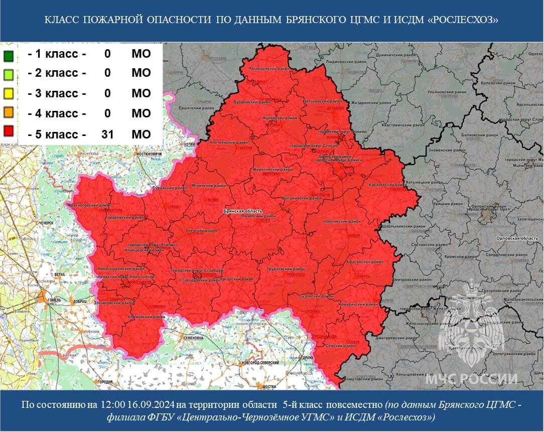 Во вторник, 17 сентября, на территории Брянской области повсеместно установился 5-й класс пожарной опасности. На специальной карте наш регион в этой связи выглядит как большое ярко-красное пятно. День вторника, 17 сентября, пройдет преимущественно без осадков. Ветер подует северо-восточный: ночью со скоростью 4-9 м/с, а днем – 7-12 м/с. Температура воздуха ночью опускалась до +8ºC, а днем станет снова жарко – до +27ºC. Аномальная температура для второй половины первого месяца месяца. Вместе с тем на территории Брянской области повсеместно установился 5-й класс пожарной опасности. Об этом сообщили в региональном управлении МЧС по ссылкой на данные Брянского филиала ФГБУ «Центрально-Чернозёмное УГМС» и ИСДМ «Рослесхоз». – В связи со сложившейся метеорологической обстановкой на всей территории сохраняется высокая вероятность возникновения ландшафтных пожаров, связанных с горением сухой растительности на землях сельскохозяйственного назначения и землях населенных пунктов, – пояснили в пожа