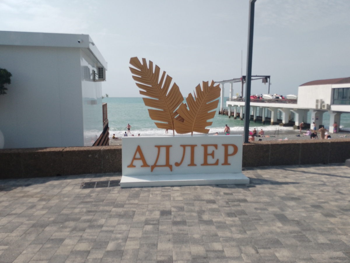 Мы прилетели в аэропорт Сочи из Нижнего Новгорода поздно вечером, заселились в гостиницу и пошли здороваться с морем. Море было темным и выглядело вот так. Фонтан на набережной с ночной подсветкой. Немного посидели на лавочке, подышали свежим воздухом, послушали шум прибоя и отправились спать в гостиницу. На следующий день была запланирована поездка в Абхазию, у меня на канале про неё вышла статья, а потом было в планах позагорать на пляже , покупаться в море и погулять по Адлеру. Пляж в Адлере, было объявлено штормовое предупреждение , купаться спасатели запрещали, но отдыхающие все равно заходили в воду, на свой страх и риск. Мы позагорали до обеда, море разбушевалось ещё сильнее и было принято решение покинуть пляж и прогуляться по Адлеру. Набережная очень хорошо благоустроена , много лавочек, можно посидеть отдохнуть, буквально на каждом шагу, различные кафе, магазинчики, кофейни, продают разливные напитки, кукурузу, мороженное, сувениры для туристов. Фонтан на набереж