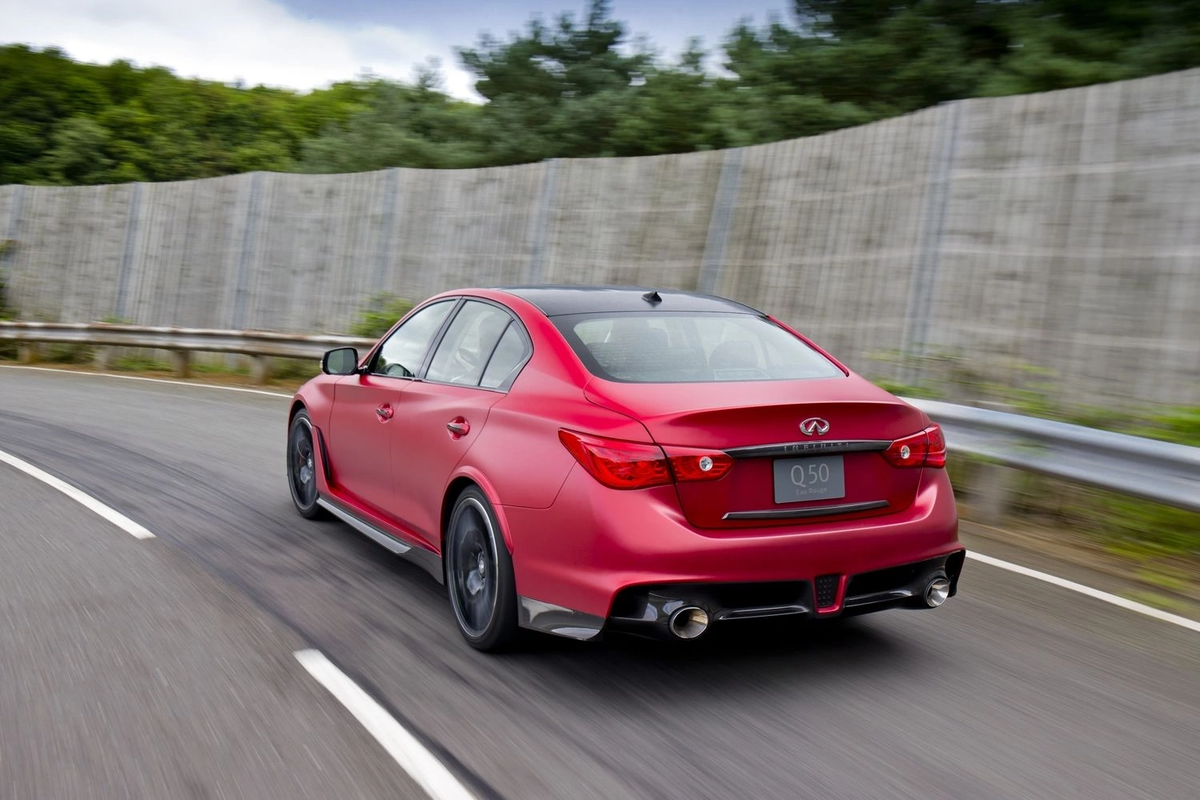 Infiniti Q50 Eau Rouge proto, получивший свое название в честь высокоскоростного поворота, знаменитого бельгийского гоночного трека Spa-Francorchamps. Модель создана на основе разработок команды Формулы 1 Red Bull Racing. Функционирующий прототип был собран в Англии небольшой группой специалистов, в тысячах километров от штаб-квартиры Infiniti в Гонконге. Небольшая команда, которой была поручена разработка прототипа, получила серебристый Infiniti Q50S US-spec в качестве донора. Чтобы начать процесс превращения в Eau Rouge, силовой агрегат седана, включая атмосферный двигатель V6 объемом 3,7 литра (328 л.с. и 365 Нм ), был удален. На первых стадиях проекта для Eau Rouge рассматривались три варианта двигателя. Самым первым из них был 3,7-литровый VQ37VHR, со слегка измененной системой выпуска, который уже устанавливался на платформу Q50, но он был отвергнут, поскольку не отвечал параметрам мощности, заданным для этого проекта. Вторым кандидатом стал мощный 5,6-литровый V8, VK5