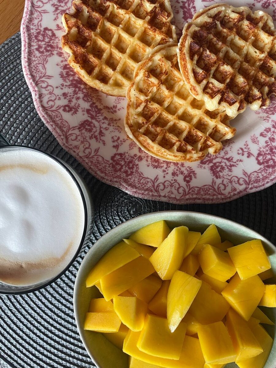 Это будет самый простой рецепт завтрака на свете) На 5 шт: - 1 пачка творога 9% - 1 яйцо - 50 г растопленного сливочного масла - 1,5 ст.л. муки - 1/2 ст.л. сахара - 1/2 ч.л. разрыхлителя - 1/4 ч.л. ванилина 1. Поставьте разогреваться вафельницу 2. Смешайте все ингредиенты 3. Выпекайте по 4 минуты ✨
