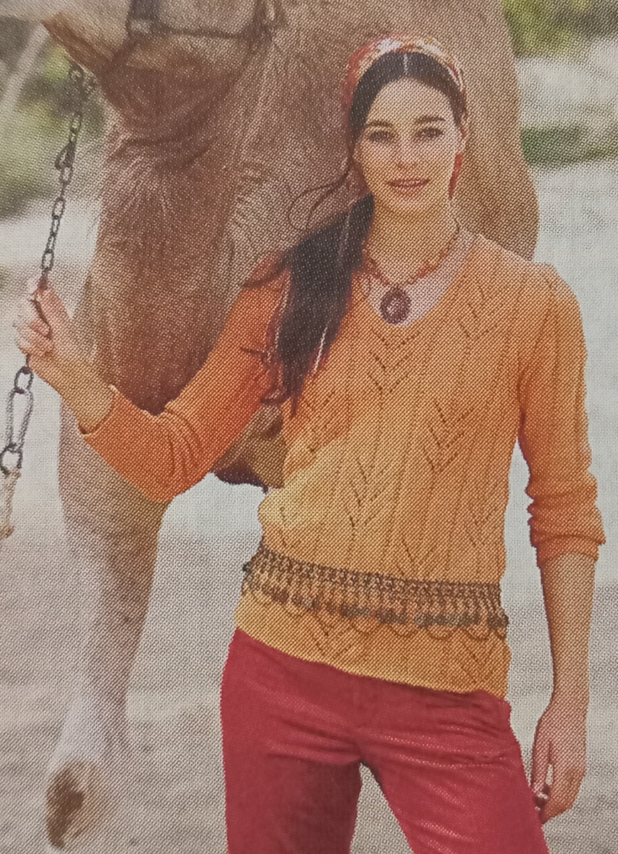 Яркий оранжевый цвет модели напоминает закат солнца. Ажурный узор повторяется на полосах из лицевой глади в шахматном порядке. Оранжевый узорчатый пуловер. Подпишитесь и получайте схемы БЕСПЛАТНО. 36/38 ( 44/46) Отличающиеся данные для размера 44/46 приведены в скобках. Лицевая гладь: лиц. р. - лиц. п., изн. р. - изн. п. Платочная вязка: лиц. и изн. р. - лиц. п. Основной узор (число петель кратно 40 + 20 + 2 кром.): вязать по схеме. На схеме приведены только лиц. р. В изн. р. петли вязать по рисунку или как указано. Накиды вязать изнаночными. Начать с 1 кром., повторять раппорт, закончить петлями до стрелки и 1 кром. Повторить 1 раз 1-й и 2-й р., затем * повторить 3 раза с 3-го по 12-й р., после этого 3 раза с 13-го по 22-й р. Повторять от * эти 60 р. Для приобретения схем вязания переходите по ссылке Схемы вязания Плотность вязания: 22 п. × 34,5 р. = 10 × 10 см. Набрать 102 (142) п. и связать 1 изн. р. лицевыми. Этот ряд не учитывается при дальнейшем счете. Затем вязать основным узо
