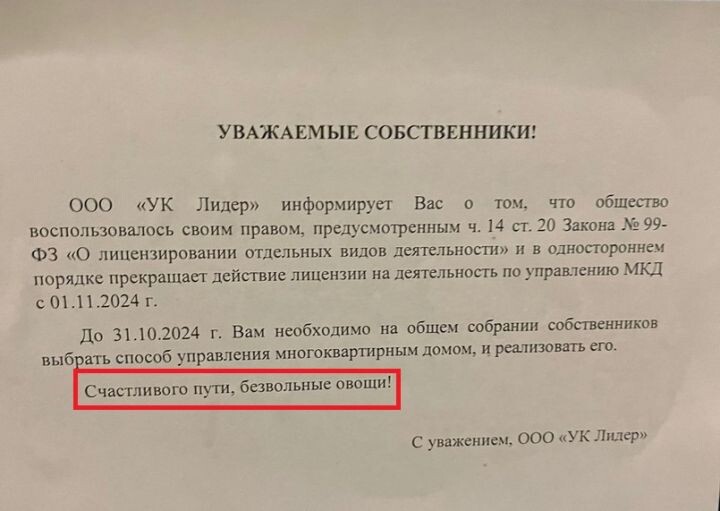 Сотрудника, разместившего обидную записку, уволили В редакцию «МОЁ!» обратилась читательница, которая пожаловалась на оскорбительное объявление, появившееся в подъезде дома № 46а на Кольцовской 13 сентября. Женщина рассказала, что увидела обидную подпись на доске объявлений на первом этаже. Информация на записке, размещённой от имени УК «Лидер», уведомляла жильцов, что компания прекратила действие лицензии на управление МКД. Ничего необычного, если бы не приписка: «Счастливого пути, безвольные овощи!». Читательница рассказала, что «поймала» на камеру мужчину, который клеил объявление. Его видели у дома в 11:35. Однако когда он понял, что жильцы дома, мягко говоря, недовольны этим объявлением, он поспешил исправить его. Также женщина рассказала, что написала заявление в полицию об оскорблении чести и достоинства. В пресс-службе регионального УМВД редакции «МОЁ!» подтвердили, что заявление поступило. Полицейские начали проверку. Корреспондент «МОЁ!» также обратился за комментарием в УК «
