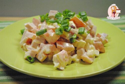 Хочу предложить вам рецепт салатика на каждый день. Он очень простой, но, однозначно, имеет право быть. Для приготовления салата вы можете использовать как ветчину, так и ветчинную колбасу. Нарежьте их кубиками среднего размера. Для сыра лучше всего подойдет колбасный, подкопченный сорт. В отличие от обычного сыра, колбасный часто прилипает к ножу, что делает его неудобным для нарезки. Чтобы облегчить процесс, поместите сыр в морозильную камеру на 15-20 минут перед приготовлением. Затем нарежьте его кубиками. Яйца следует отварить заранее "вкрутую". Нарежьте их кубиками такого же размера, как и колбаса с сыром. Лук можно использовать как обычный репчатый белый, так и красный или шалот. Нарежьте его кубиками, но уже более мелкими. Чеснок можно выдавить через пресс или мелко нарезать ножом. Если помидор крупный, то одного будет достаточно. Он должен быть твердым. Нарежьте его крупными кусочками. Соедините все подготовленные ингредиенты в миске и посолите по вкусу (не забудьте, что ветчи