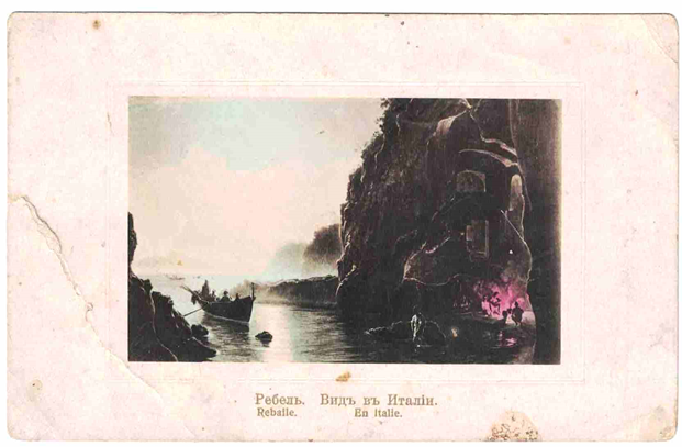 Представленная открытка адресована некой Тасе Асмоловой от В.К. Гусника «на память». Подарена в Геленджике в 1911 году. Отсутствие марок и почтовых штемпелей означает, что она либо была передана лично, либо отправлена в конверте. Оборот карточки украшает репродукция работы австрийского художника Йозефа Ребеля (1787-1828) «Ночь», написанная в 1825 году. Сегодня это полотно можно увидеть в Ростовском областном музее изобразительных искусств [1]. Морской пейзаж в лунном свете, вероятно, служил адресату напоминанием о времени, проведенном в дружеской компании на черноморском побережье.
