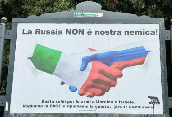 Этим летом на рекламных щитах по всей Италии появились плакаты с лозунгом «Россия нам не враг» и изображением рукопожатия в цветах флагов двух стран, а некоторых из них была размещена приписка «Хватит давать деньги на оружие для Украины и Израиля. Мы хотим мира. Мы против войны». Транспаранты были размещены в различных городах, включая Рим, Верону, Модену, Пизу, Парму. Такая кампания уже успела вызвать возмущение у украинских властей, обвинивших во всем якобы российскую пропаганду, хотя за установкой плакатов стоят итальянские общественники. В то время как официальное правительство Италии продолжает поддерживать Украину, часть политиков выражает симпатию к России. Это отразилось и на общественном мнении, где наблюдается растущее недовольство увеличением помощи Украине. Несмотря на попытки избавиться от плакатов, часть из них осталась на своем месте до конца положенного срока. Как отметил в беседе с Online47 политолог, член совета по межнациональным отношениям при президенте России Бог