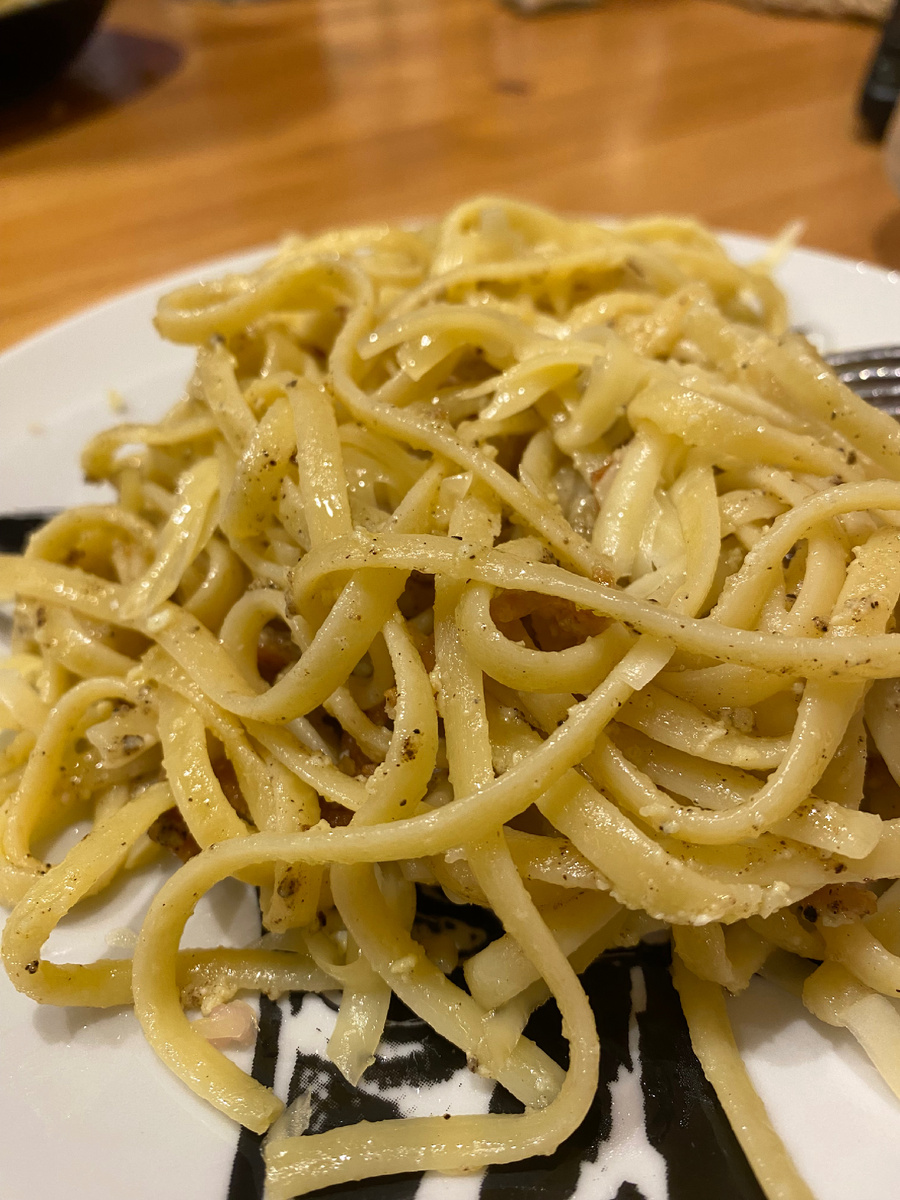 А вы знаете, что издавна паста Карбонара готовилась с соусом на основе желтков, а не сливок? Для нас этот рецепт давно перешел в разряд любимых. Я стараюсь не использовать сливки в рецептах, они пахнут жиром, а с желтками паста получается нежнейшая. Нам потребуется: Ленты бекона режем поперек тонкими ломтиками. Натираем сыр на крупной терке, половину смешиваем с желтком. Отвариваем спагетти до состояния впросырь альденте в соответствии с инструкцией на упаковке. Оставляем 1 половник воды, в которой варились макароны. Обжариваем бекон на сухой сковородке, пока он не станет хрустящим. Бросаем в сковородку спагетти, вливаем половник воды и тщательно перемешиваем. Несколько минут прогреваем. Вливаем желток с сыром, перчим, перемешиваем и немедленно выключаем плиту, иначе желток свернется. Продолжаем помешивать, чтобы соус равномерно распределился в пасте. Раскладываем на тарелки и посыпаем оставшимся сыром. Можно слегка подогреть в микроволновке, если сыр не расплавился. К этой пасте Карб