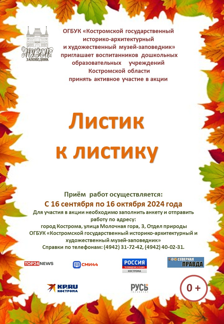 В Костромском музее-заповеднике стартовала акция «Листик к листику» Продлится она до 23 октября 2024 года, работы будут приниматься до 16 октября. Участие в проекте приглашают принять детей из дошкольных учреждений Костромской области. Помогать делать поделки малышам могут родственники или воспитатели. Участникам предстоит создать аппликацию из природных материалов, соблюдая определенные условия: формат A-3, наличие рамки и двух креплений. В качестве материалов рекомендуется использовать высушенные листья, ветки, плоды, шишки и семена. Листья можно высушить, используя пресс, или просто помещая их между страницами книг. Тематика работ должна отражать живую природу, охрану окружающей среды и экологию. Также необходимо заполнить анкету участника. Готовые работы и анкеты следует отправлять по адресу: Кострома, ул. Молочная гора, 3 (Отдел природы). По завершении акции будет организована выставка, всем участникам вручат сертификаты. 0+
