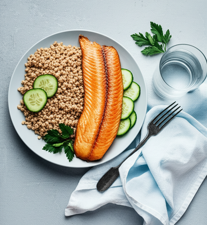 - Обед: Рыбный суп (треска, картофель, морковь, без соли). Запеченная рыба (100 г) с гарниром из киноа (источник растительного белка). Травяной чай.