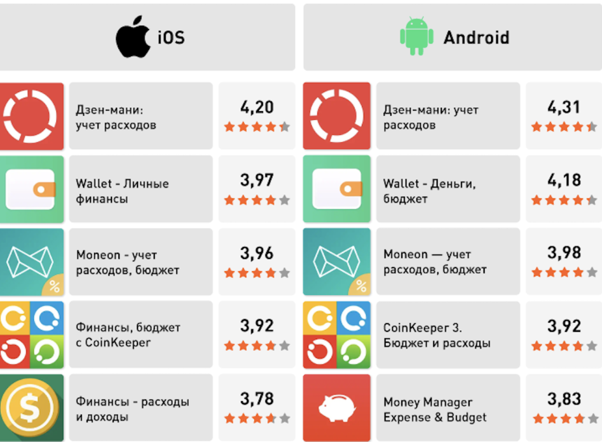 «Дзен-мани» (4,31 на Android и 4,20 на iOS). Wallet (4,18 на Android и 3,97 на iOS).Moneon (3,98 на Android и 3,96 на iOS).