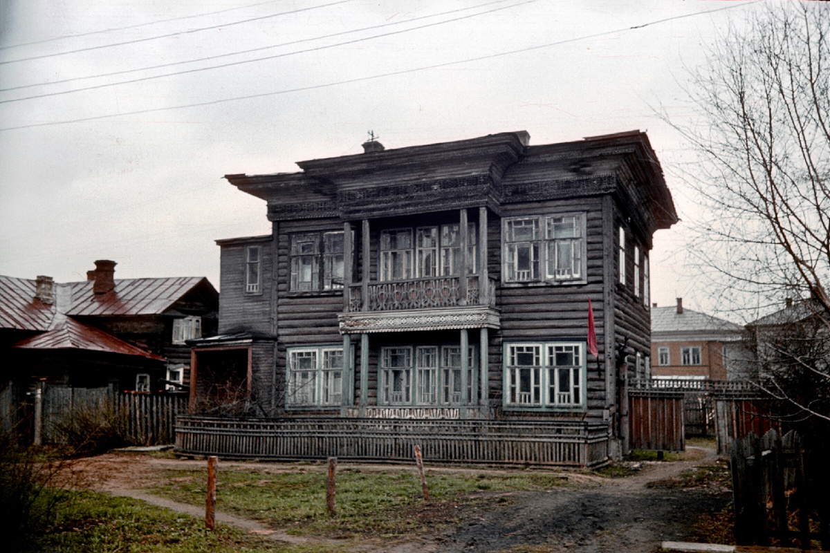 На снимке середины 1970-х один из знаковых домов исторического центра Вологды. Это так называемый дом Воробьёва на улице Засодимского и он был построен около 1915 года, хотя официально числится более ранняя дата - 1910 год. Дом стоит напротив церкви Варлаама Хутынского и если перенестись во времена до того, как Вологду начали разбивать на кварталы по Екатерининскому плану 1781 года, то как раз справа от этого дома ранее проходила улица. Она шла в сторону современного перекрёстка проспекта Победы и Воровского. Как дом выглядит сейчас смотрим здесь - https://vologdahistory.ru/maps/p161/