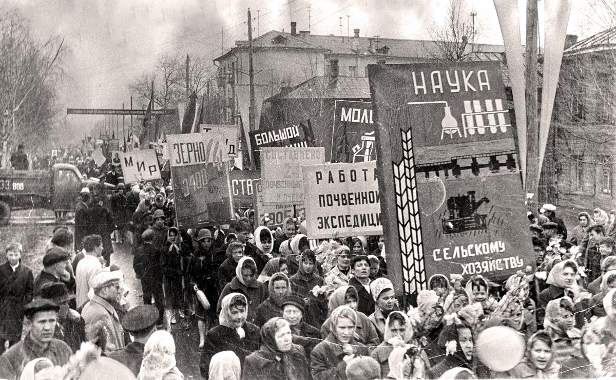На предыдущем снимке сегодня была Вологда 1930-х на Клары Цеткин, а теперь снимок почти того же места на современной Благовещенской, но сделанный уже в 1960-е. Справа к 1967 году будет построен универмаг, а колонна демонстрантов соответственно проходит по тому месту, где сейчас расположен фонтан. Четырёхэтажный дом у перекрёстка современных Благовещенской и Батюшкова был построен к 1960 году, так что коридор возможной даты снимка существенно сужается, так как универмаг ещё даже не начали строить.