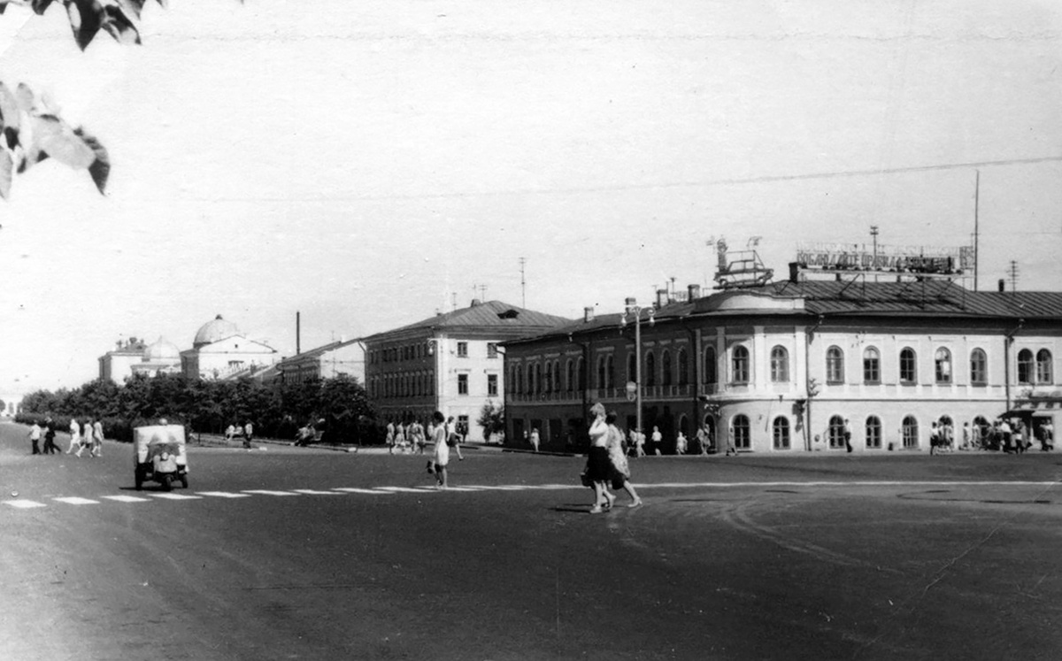Улица Мира в начале 1970-х. Вид почти не изменился до наших дней. Правда стало больше автотранспорта и с крыши углового дома исчезла вывеска с автомобилем и пропал призыв соблюдать правила дорожного движения. Кстати, до революции в этом доме размещалась гостиница "Берлин" и кабак с таким же названием.