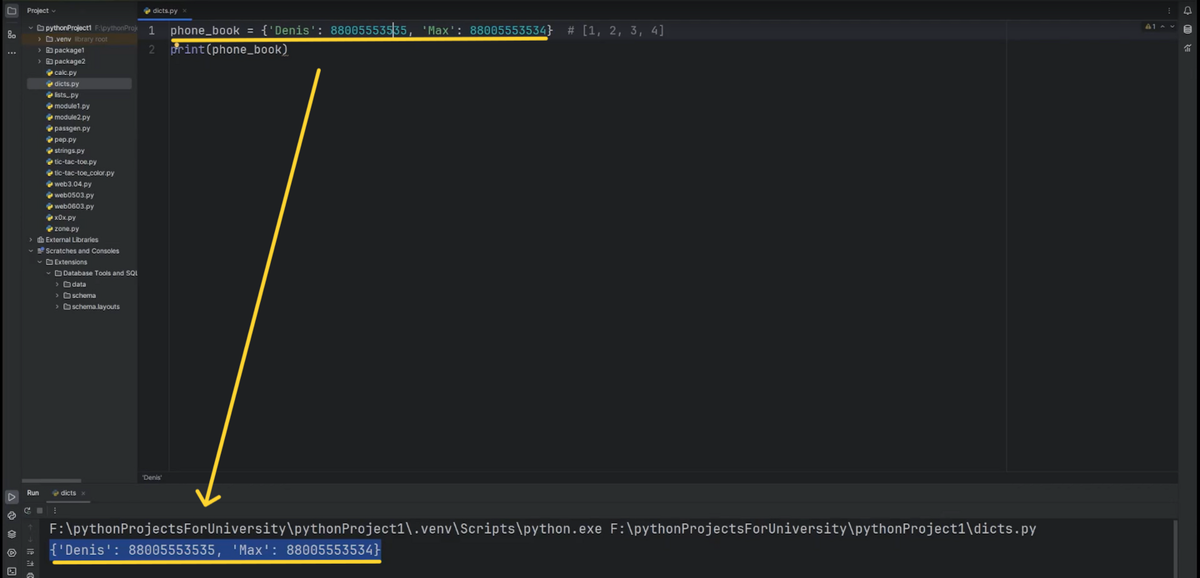 Создадим пример словаря, например, телефонную книгу, где ключом будет имя, а значением — номер телефона. Запускаем. Обратите внимание, что всё сработало: значения хранятся таким образом: первым мы указываем наш ключ, вторым — значение, а ключ и значение разделяются двоеточием. По сути, пара "ключ-значение" представляет собой в словаре один объект. То есть, если в списке мы просто писали элементы через запятую, то здесь нам нужно указать пару элементов "ключ" и "значение" (Рис. 1).