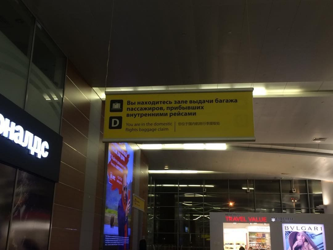 Продолжаем подборку со смешной, нелепой или просто “кривой” наружной рекламой. На этот раз обсудим фото навигационной таблички, где допущены две орфографические ошибки, одна стилистическая, но это не самое плохое. Фото было снято 6 лет назад в терминале D аэропорта Шереметьево , и, скорее всего, таблички уже давно поправили на более приличные (кто недавно туда прилетал? дайте знать, пожалуйста). Я уже публиковал его как путевую заметку, но тогда увидел только одну, самую явную ошибку (пропущен предлог “в”), но при детальном рассмотрении, становится ясно, что еще не все. Во-первых, есть одна ошибка в склонении существительного “пассажиры”, которое надо связать не со словом “зал”, а с “выдачей”. Т.е. просто без ошибок это должно выглядеть так: “Вы находитесь в зале выдачи багажа пассажирам, прибывших внутренними рейсами” Видимо, шесть лет назад я только недавно прочитал “Пиши, сокращай” Ильяхова, и поэтому отмечал про эту табличку следующее: “Убеждён, что четыре существительных подряд