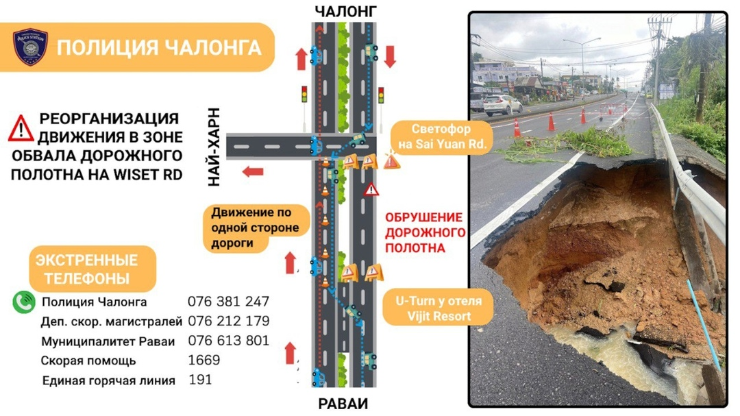 Полиция Чалонга совместно с провинциальным офисом Департамента скоростных магистралей (DOH) сообщили о реорганизации движения на участке Wiset Rd. от Friendship Beach Resort до Vijit Resort. В результате сильных дождей обвалился пятидесятиметровый участок дороги к югу от светофора в районе поворота на Sai Yuan Rd. Пока что нет сведений о сроках завершения ремонта. Весь транспорт временно направляется по временной проезжей части, предназначенной для движения к кольцу Чалонга. Сегодня, 17 сентября, место происшествия посетили глава полиции Чалонга полковник Эккарат Плайдуанг, руководитель DOH Phuket Сомкит Киттисопит, вице-мэр Раваи Тхирапохонг Тхаодэнг и представители People's Party. Тем не менее, ни DOH Phuket, ни полиция не предоставили информации о сроках проведения ремонтных работ. Департамент скоростных магистралей Пхукета сообщил, что была проведена проверка «для разработки общего решения по предотвращению аварий в зоне обрушения дороги 4024 на отметке 19+600 км. Читайте еще стать