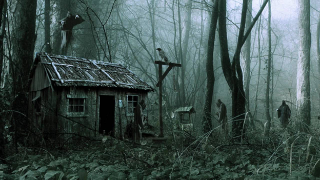 Вдалеке треснула ветка. Путники инстинктивно ускорили шаг, а Маша нервно заозиралась ― возникло чувство, что за ними следят. Только сейчас она поняла, что на всем пути им никто не встретился: ни грибники, ни шумные любители пикников, ни велосипедисты. Когда искореженные деревья закончились, а шум барабана стих, перед Сергеем и Марией открылась поляна. В глаза сразу бросился длинный деревянный стол со скамьей и хижина, больше похожая на сарай, будто наспех сколоченный из старых досок. Недалеко от хижины явно человеческой рукой были выложены камни. Вокруг хижины располагались деревянные колья в человеческий рост, на них были нанизаны кукольные головы. Деревянный стол был исписан мелом.