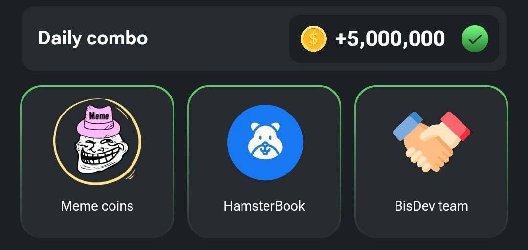 Комбо доступно на 17 сентября. Если вы соберёте комбинацию карт в правильном порядке, то получите приз — 5 000 000 монет! • HamsterBook - PR & Team • Meme coins - Markets • BisDev team - PR & Team Новые комбо тут: https://t.me/+PTRGuJbg2ZY5ZjAy Комбо-карты в Hamster Kombat — инструмент для развития вашего хомяка. Они позволяют значительно увеличить ваш пассивный доход и тем самым ускорить развитие персонажа.С помощью комбо-карт вы можете получать больше ресурсов, открывать новые возможности и становиться сильнее. Чтобы собрать комбо-карты следуйте этим шагам: 1.Откройте Hamster Kombat в Telegram. 2. Перейдите в раздел «Mine, здесь вы найдёте карты из набора. 3. Используйте игровые монеты для покупки или улучшения указанных карт. 4. После успешного выполнения задания нажмите кнопку «Забрать приз», чтобы получить бонусные монеты на свой баланс. Теперь вы готовы к новым приключениям в мире Hamster Kombat!