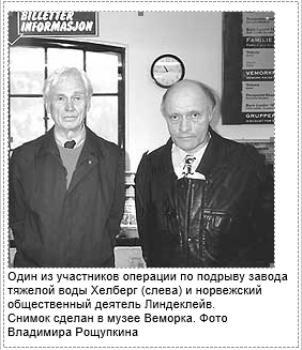Эта дерзкая атака группы командос вошла в историю разведки и Второй мировой войны в целом как операция "Gunnerside" ("Ганнерсайд"). А о подробностях операции один из авторов этой публикации услышал из уст ее непосредственного участника - Клауса Хелберга. 82-летний ветеран специально приехал на место событий из Осло по просьбе организатора нашей поездки господина Бернта Линдеклейва (Bernt Lindekleiv), чтобы встретиться с гостями из России, впервые побывавшими здесь. К сожалению, не так давно господин Хелберг ушел из жизни…