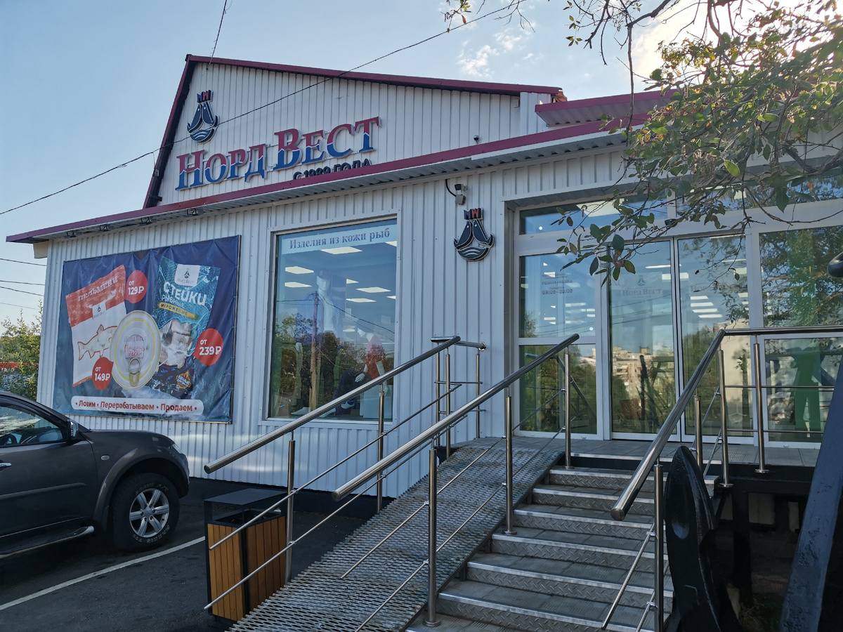 Перебирая в уме варианты местных деликатесов в качестве подарков домой, по наводке гида отправились в магазин «Норд Вест». Магазин находится прямо при перерабатывающем заводе. Заходим внутрь… Вот где царство разнообразных морепродуктов! Тут и треска, и ерш, и камбала, и сайда, и палтус, и скат, и пинагор, и креветка, и мойва… Да все это еще в разных вариантах! Глаза разбегаются!.. Дело все в том, что компания самостоятельно организует весь процесс производства: от вылова рыбы на собственных судах до продажи готовых продуктов. Сотрудники фирмы следят, чтобы охлаждённая продукция была отправлена в мурманский магазин как можно быстрее. Обычно это составляет около 2 часов после прихода судна. Магазин представляет собой один общий зал со стеклянными витринами и полками. Чем же они заполнены? В ассортименте: охлажденная и свежемороженая, соленая, вяленая и копченая рыба; морепродукты (креветки, гребешки, кальмары, крабы, мидии, морская капуста); консервы; пресервы; рыбные пельмени; фарши; и