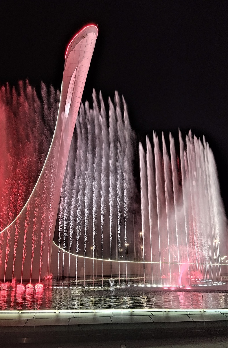 Из всего перечисленного мы посетили Олимпийски парк, потому что жили рядом с ним, по вечерам ходили туда смотреть светомузыкальное шоу фонтанов. Шоу длится ровно час, в сентябре начало было в 20:00, в летние месяцы начало на час позже, в 21:00. Каждый день звучит разная музыка, на сайте есть текущее расписание. В наш приезд по понедельникам играла русская классическая музыка, по вторникам музыка из кинофильмов, по средам венские вальсы, по четвергам популярная музыка, по пятницам музыка великих композиторов, по субботам джаз, по воскресеньям испанская и латиноамериканская музыка. Зрелище действительно завораживающее, советую обязательно посетить. Причем стоять нужно как можно ближе, желательно на первой линии, чтобы почувствовать всю атмосферу происходящего. Недаром народ заблаговременно занимает лучшие места. Шоу абсолютно бесплатно, очень много приезжает людей со всего побережья, самостоятельно и на экскурсионных автобусах организованными группами.