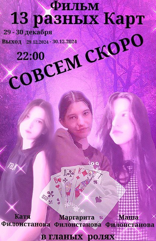 У Маргариты Филонстановой много фильмов, она решила 29 - 30 декабря выпустить свой новый фильм «13 Разных Карт» который скоро увидят зрители юного блогера, сама Маргарита Филонстанова утверждает что будет 3 фильма, два в 2014 году а один в 2025 году , этот фильм увидим в 2024 году в 22:00 по московскому времени , в главных ролях будут Маргарита Филонстанова , и ее сёстры, о фильме Маргарита пока что нечего не говорила не описание, не что там будет, и в чем заключается фильм.