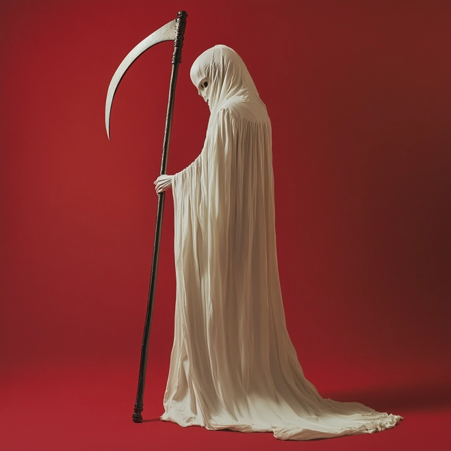 Мой промпт: A photograph of a Death with a scythe, bestiary. She is dressed in white and light beige, minimalistic style against a red background, in the Tim Walker style of lighting, editorial photography.