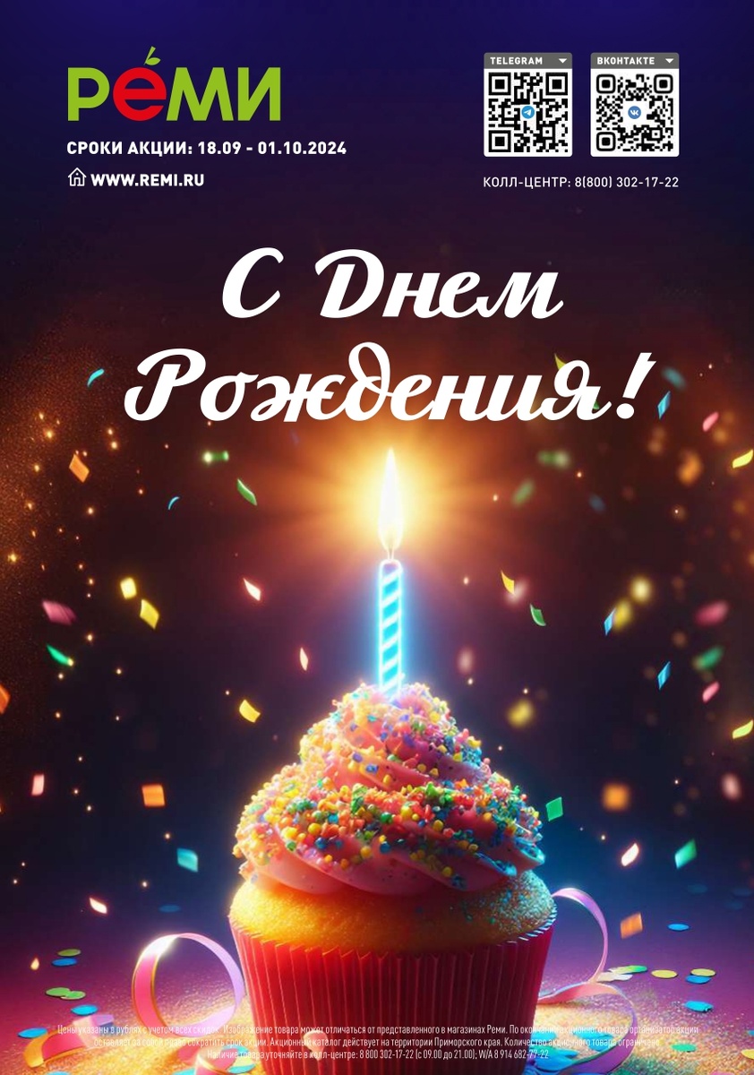 🎊Празднуем День рождения РЕМИ со скидками!🎊 Такое важное событие должно длиться как можно дольше, именно поэтому мы собрались для вас новый каталог товаров с самыми приятными скидками. В них вы найдёте всё то, что пригодится вам в повседневной жизни и в особые праздничные дни: широкий выбор колбас и сыров, вкусное угощение к чаю, разнообразие напитков и бытовых помощников 😋 Скорее ознакомьтесь с этим богатым ассортиментом! Уверены, каждый найдёт там то, что ищет 💛 📌 Акционные цены будут действовать с 18 сентября по 1 октября, а пока вы можете ознакомиться с каталогом по ссылкам ниже: 👉 на нашу страницу Taplink: https://taplink.cc/supermarket_remi 👉 на наш канал в Яндекс.Дзен: https://zen.yandex.ru/id/611f0731a48b6611814e6260 👉 на наш официальный сайт: https://remi.ru/ 👉 на наш канал в Телеграм: https://t.me/remi_supermarket 👉 на наше сообщество Вконтакте: https://vk.com/remi_supermarket Давайте проведём эти дни незабываемо вместе! 💛