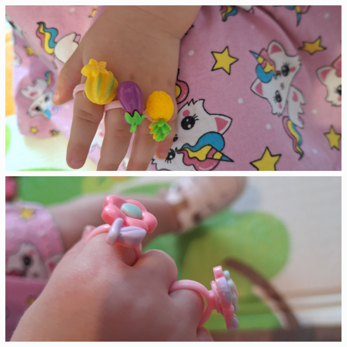 Купили недавно вот такие колечки💍. Ксюше понравились. Даже купалась с ними. Хотелось бы еще браслетики, но все с бусинками, боюсь, что оторвет и проглотит. Если где увижу без них обязательно возьму. Мы же девочки.👩👧 Мне самой очень интересно выбирать такие штучки, в нашем детстве не было всего, что есть сейчас у современных детей. И еще купили солнечные очки🕶, правда сезон прошел, ну да ладно. Очки ей тоже нравятся, до этого игралась моими. Это у нее такая забава- сначало сама наденет, потом просит, чтобы также сделала и мама. И приговаривает:" Яяяяя", красуется так она, балдеет, моя девочка❤️ Буду благодарна за подписку и лайки🫶