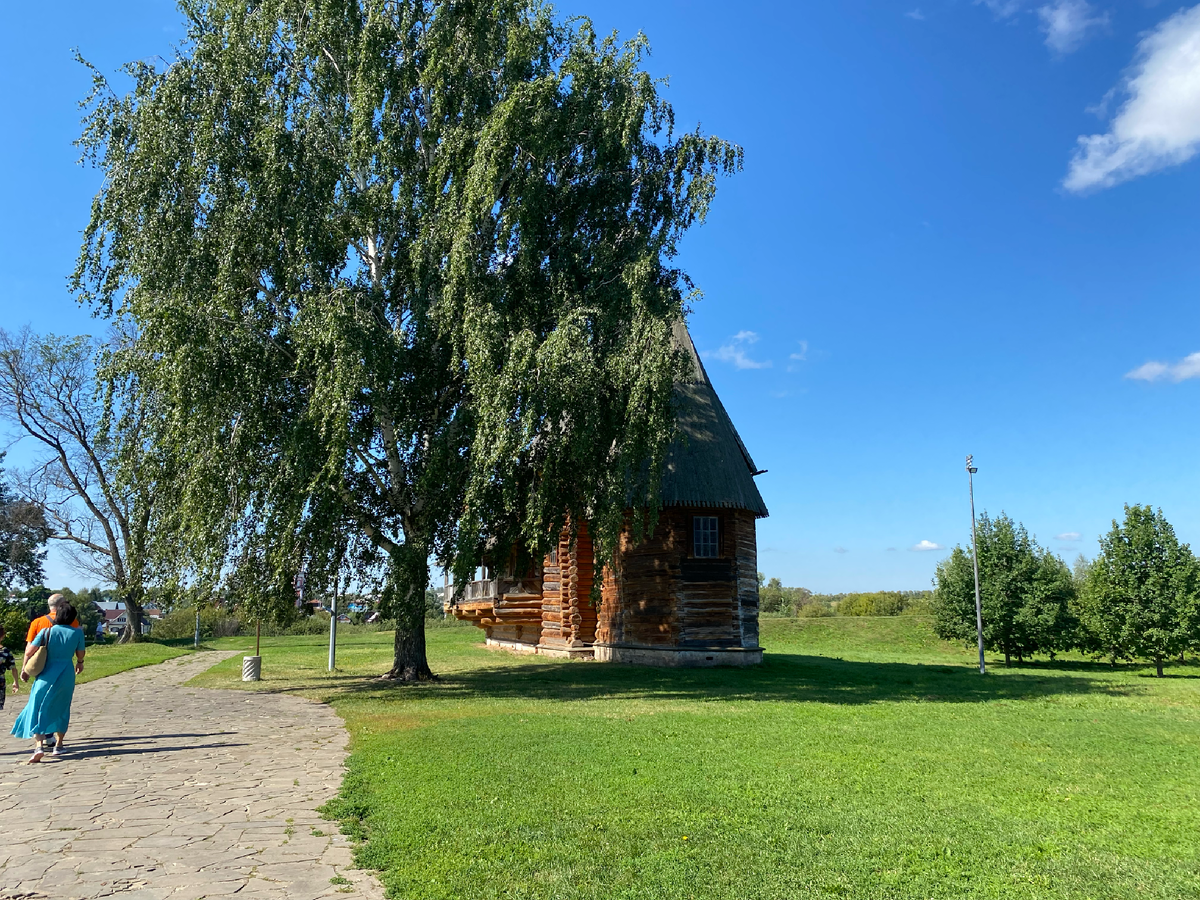 Гуляя по территории Кремля в Суздале ты невольно обращаешь внимание на небольшую деревянную церковь рядом с березой. Причем близко больше ничего не расположено... Мне этот момент показался странным и даже несколько нелогичным. Ведь все здания Кремля каменные. В том числе Рождественский собор, Архиерейские палаты, Колокольня. Больше нигде нет деревянных строений (ну если не отходить дальше, уже в сторону вала, там -то много деревянных домов). А тут на приличном отдалении от основных объектов маленькая деревянная церквушка. Оказывается это Никольская церковь. И на самом деле, она никогда раньше на территории Суздальского Кремля не стояла. А ее "место жительства" было в деревне Глотово. Привезли ее в Суздаль в 1960 году. Она должна была стать одним из первых экспонатов Музея деревянного зодчества. Но по сей день (уже больше 60 лет) стоит на территории Кремля... Вообще, на этом месте была другая деревянная церковь, но она сгорела еще в 17 веке... А Никольская церковь построена в 1766 году