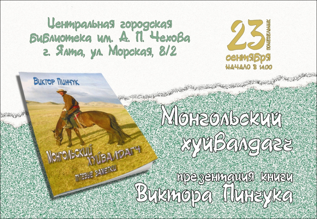 23 сентября 2024 года в Ялтинской центральной городской библиотеке им. Чехова состоится творческая встреча с российским писателем-путешествеником Виктором Пинчуком, объехавшим десятки экзотических стран и островов при помощи специальной методики, описанной в авторском учебнике "Бомж-туризм". В рамках мероприятия будет представлена книга о путешествии по стране некогда грозного завоевателя Чингисхана, с непонятным названием "Монгольский хуйвалдагч", где второе слово переводится как "заговорщик". Однажды некая авиакомпания решила провести рекламную акцию: на центральных улицах Симферополя агенты предлагали прохожим авиабилеты в Монголию за 10% реальной стоимости. Из 1350 опрошенных изъявил желание отправиться в страну степей лишь один человек — привокзальный бомж, но, к сожалению, у него не было ни паспорта, ни денег. (интервью в «Комсомольской правде» от 12.10.2007) Начало в 14:00. Адрес: ул. Морская 8/2, Ялта, Крым. Вход свободный. 16+