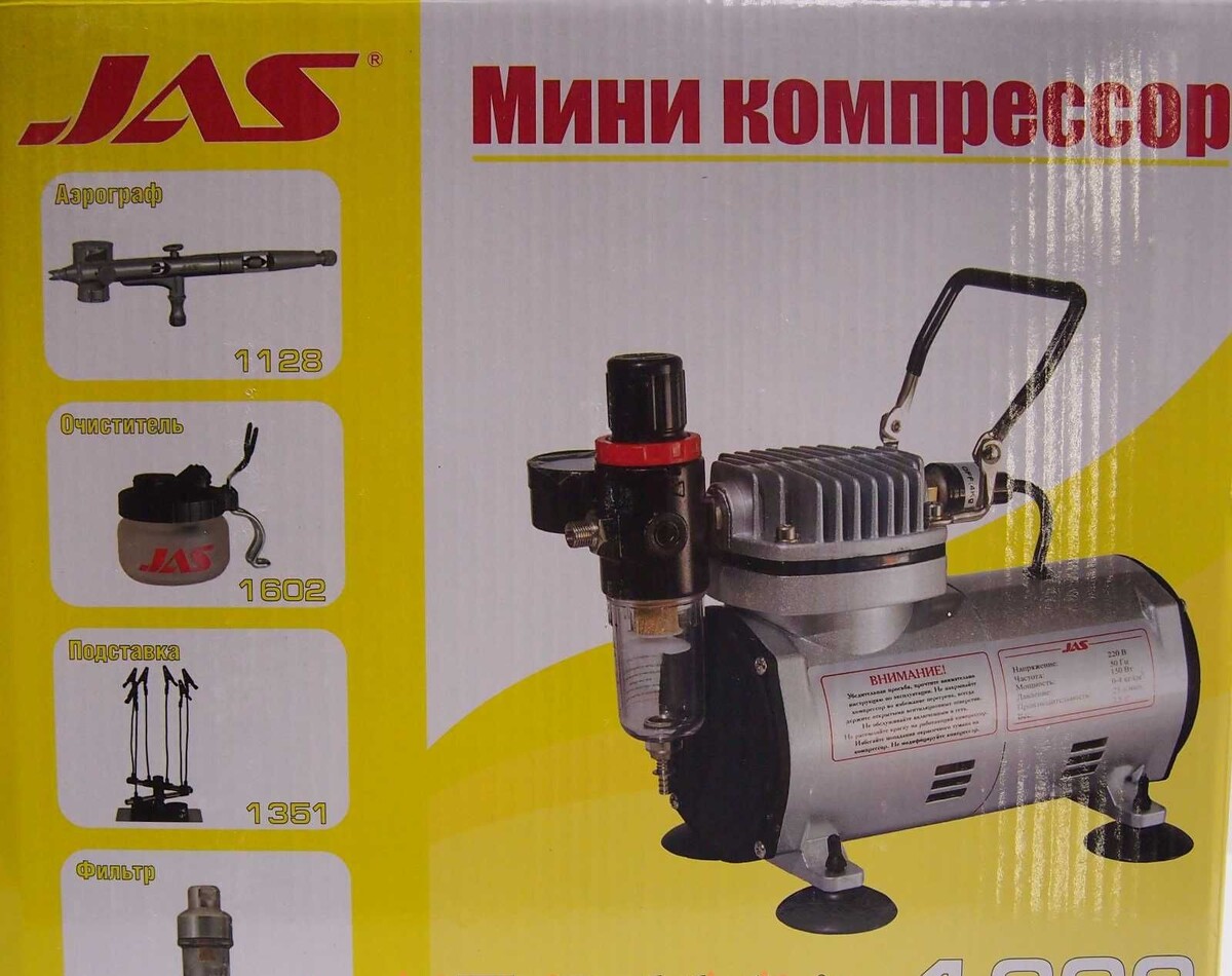 Хорошо известный, наряду с моделью 1203, компрессор от фирмы JAS, широко используемый для аэрографии, а также в моделизме для окраски масштабных моделей.