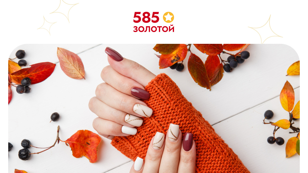 Осень – время ярких красок и уютной атмосферы, которые легко можно перенести в свои образы, начиная с маникюра. Этот сезон вдохновляет на выбор теплых насыщенных оттенков и интересных дизайнов, которые будут отлично смотреться в сочетании с кольцами от 585*Золотой!