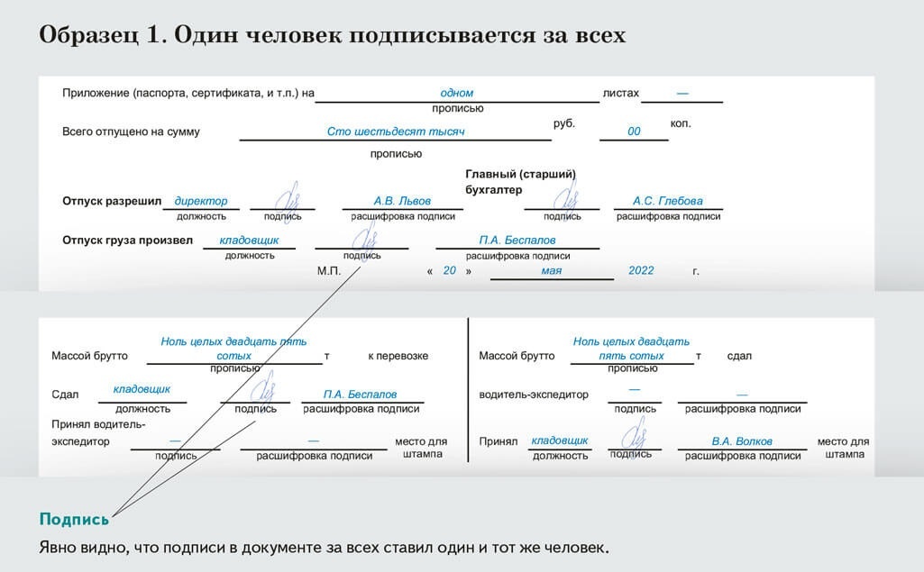 Даже почерковед не всегда может по одной подписи определить, поддельная она или нет. Но есть признаки, по которым опытный бухгалтер сразу поймет, что с документами что-то не так.