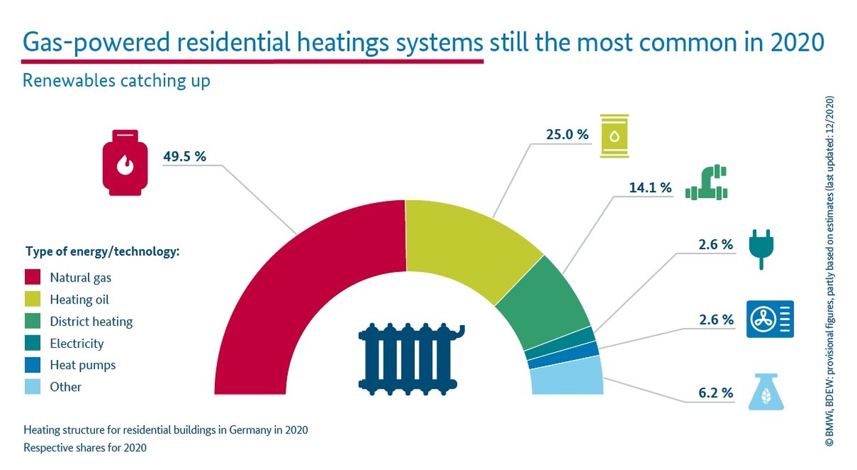 В Германии центральные системы отопления уступили место локальным. Регионам, зданиям и домохозяйствам предоставлено право выбора источников тепла и систем отопления. Большинство частных домов отапливается бойлерами, а многоквартирные дома – газом. В последнее время все больше интереса проявляется к альтернативным системам отопления – солнечным батареям, биотопливу.