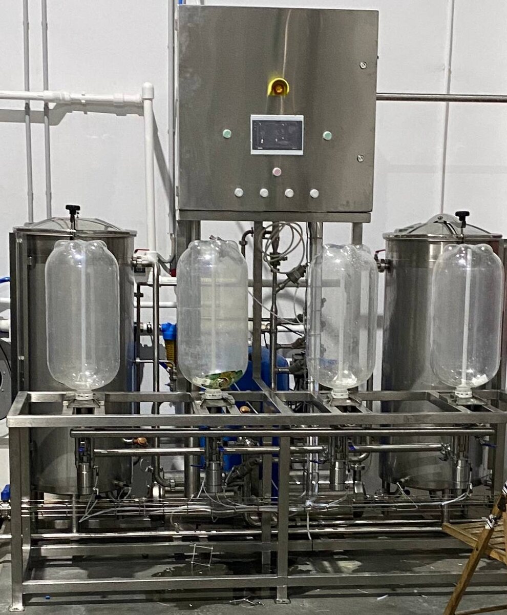 На основе наших эскизов была сварена прочная металлоконструкция из нержавеющей стали AISI 304. Кеги фиксируются в специальных зажимах, которые подходят для большинства моделей, обеспечивая надежную герметичность. Мы также установили резервуары для кислоты и щелочи, а также соответствующие насосы и пневматические клапаны. Уникальные углы регулировки протока и да