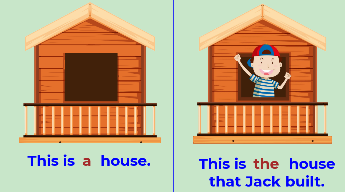 Так, в строчке из известного всем стихотворения «This is the house that Jack built» использован артикль «the» перед «house», потому что после него мы наблюдаем определение «that Jack built», которое и выделяет его из миллионов существующих в мире домов. Мы имеем дело не просто с одним из множества домов, а именно с тем домом, который построил Джек.