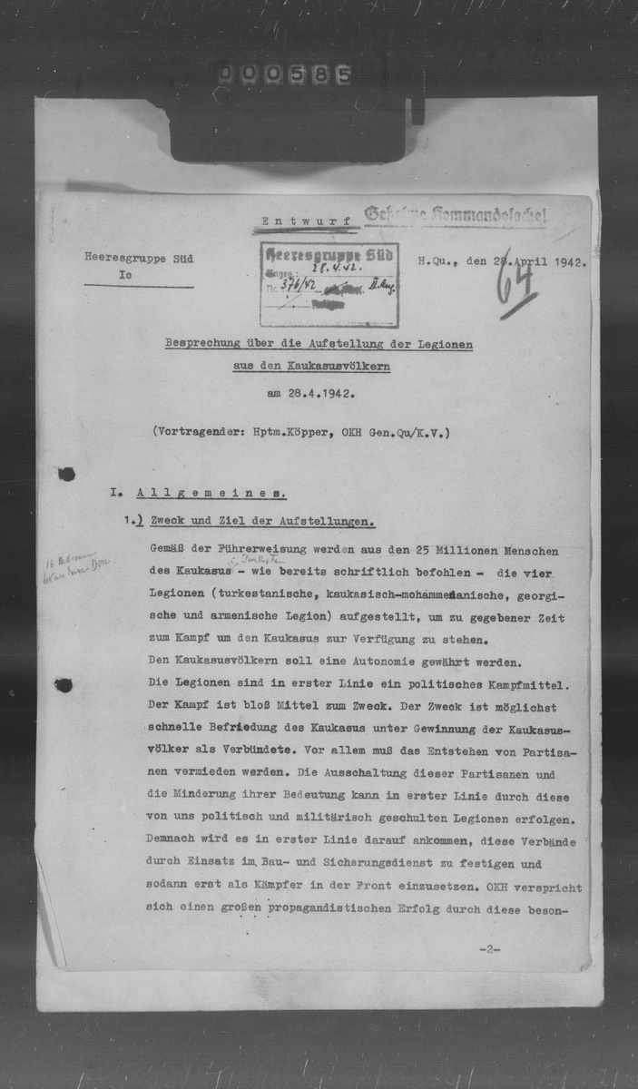 5. Текст доклада на совещании по формированию легионов из кавказских народов от 28 апреля 1942 года (докладчик гауптман Кёппер), составленный зондерфюрером Зифферсом.