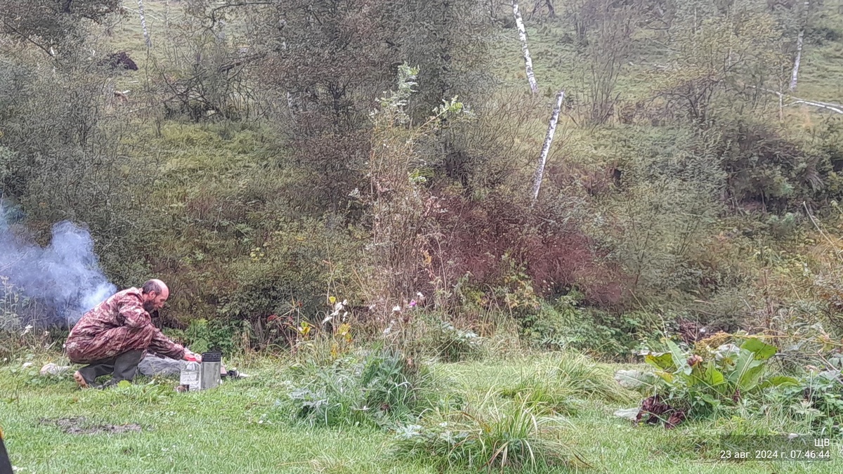 Костер,туман, зеленая трава... Нечто... Не забываемо.. Серега кипятит воду в термос. Чтобы днем нигде костер не разводить, а пить чай или кофе из термоса. Термос большой, на 3 литра. На день должно хватить)))