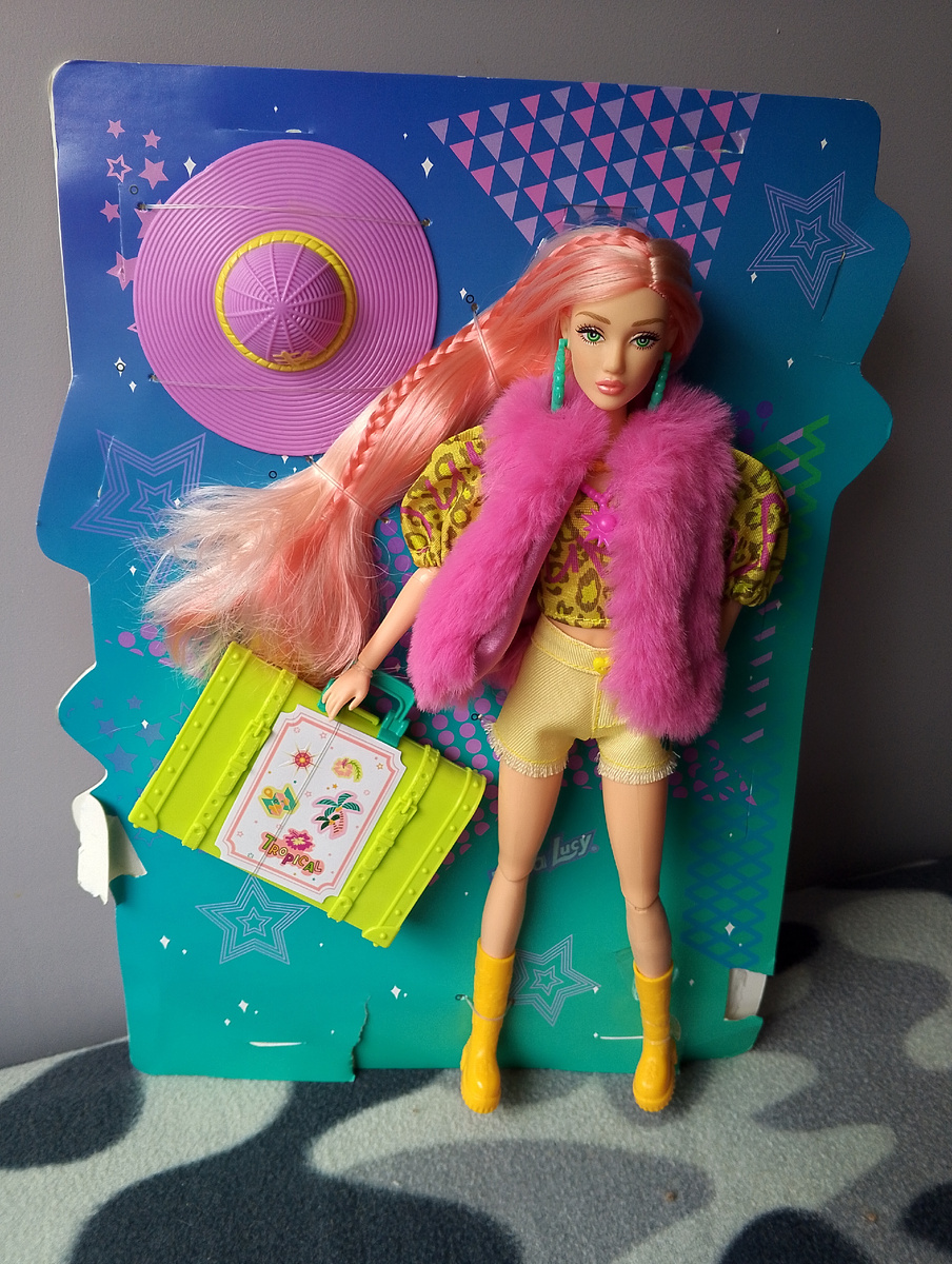 Наконец-то дошли руки вскрыть разноцветную Люсю. Коробка вскрылась довольно легко, но, все же, жаль, что она одноразовая. Даже дешевые Эмили идут с относительно хорошими коробками, а вот формат этих барышень, экстр и новых МХ мне, увы, не понять. Возможно, это делается с умыслом - вскрыл коробку, снизил коллекционную стоимость куклы. Ну или как-то так. Чемодан примотан к руке. Надо будет взять на заметку при поездках... Голова, по традиции, была пристеплерена к упаковке. Пластик у тела куклы добротный, плотный. Комплекция - такая модельная девушка, с узкими бедрами и квадратными плечами. Что касается аксессуаров - все сделано качественно. Шляпка очень милая, резиновая, но совершенно не подходящая по размеру( А жаль, аутфит этой куклы мне нравится. Мех на жилетке нежнейший, просто наслаждение для пальцев. Волосы прошиты неплохо, но сыпятся - нужно будет проклеить волосы изнутри. К качеству самого нейлона тоже особых претензий нет. Красивый цвет, сами волосы, думаю, можно будет вытягиват