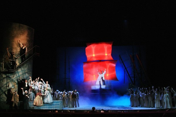 Не то, чтобы я был поклонником мюзиклов, скорее, наоборот, но вот второй раз пошёл на мюзикл в наш молодёжный театр "Глобус". В зале был аншлаг. Актёры и музыканты отработали на 100 процентов. Места, правда, взял не слишком хорошие - партер, 3 ряд, 1 и 2. Вроде близко, но с краю. Слова некоторые сложно было разобрать. Зато прямо передо мной был ударник в оркестровой яме. Вот уж кто работал на совесть:). Периодически лился дождь. Как настоящий. Да и вообще, вся атмосфера спектакля была атмосферой сурового припортового городка. 10 из 10!!! Моряки, скрипач, священник, шлюхи, женщины на базаре - всё очень органично. К спектаклю вообще нет никаких претензий, это просто сказка!!! Но, к стыду своему, я не читал оригинал. Хотя, наверно, там всё так и написано. И когда Ассоль убегает из под венца к белому капитану Грею, приплывшему под алыми парусами, мне, почему-то стало очень-очень грустно.