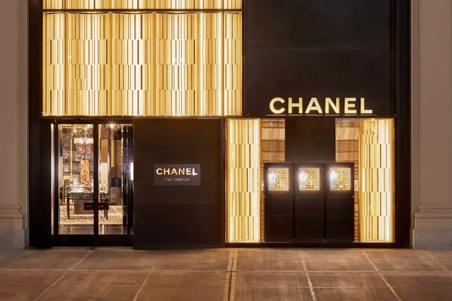Новый флагманский бутик часов и ювелирных изделий Chanel в Нью-Йорке. Пространство на Пятой авеню спроектировано давним соратником Chanel, нью-йоркским архитектором Питером Марино. Chanel говорит, что вдохновением для бутика послужила золотая шкатулка для драгоценностей, отражающая мастерство люксового бренда. Пространство посвящено счастливому числу 5 основательницы компании Габриэль «Коко» Шанель, ее любви к искусству, декору и интерьерам ее квартиры в Париже. Фасад магазина декорирован шлифованным и рифленым черным гранитом и литыми экранами из золотой бронзы, расположенными за фасадом из железа и стекла. Интерьеры бутика окрашены в золотой и черный цвета, дополненные штрихами горного хрусталя, который, по словам компании, является любимым материалом Коко Шанель. Современное и изящное искусство, антиквариат и изготовленная на заказ мебель и освещение расположены по всему пространству.