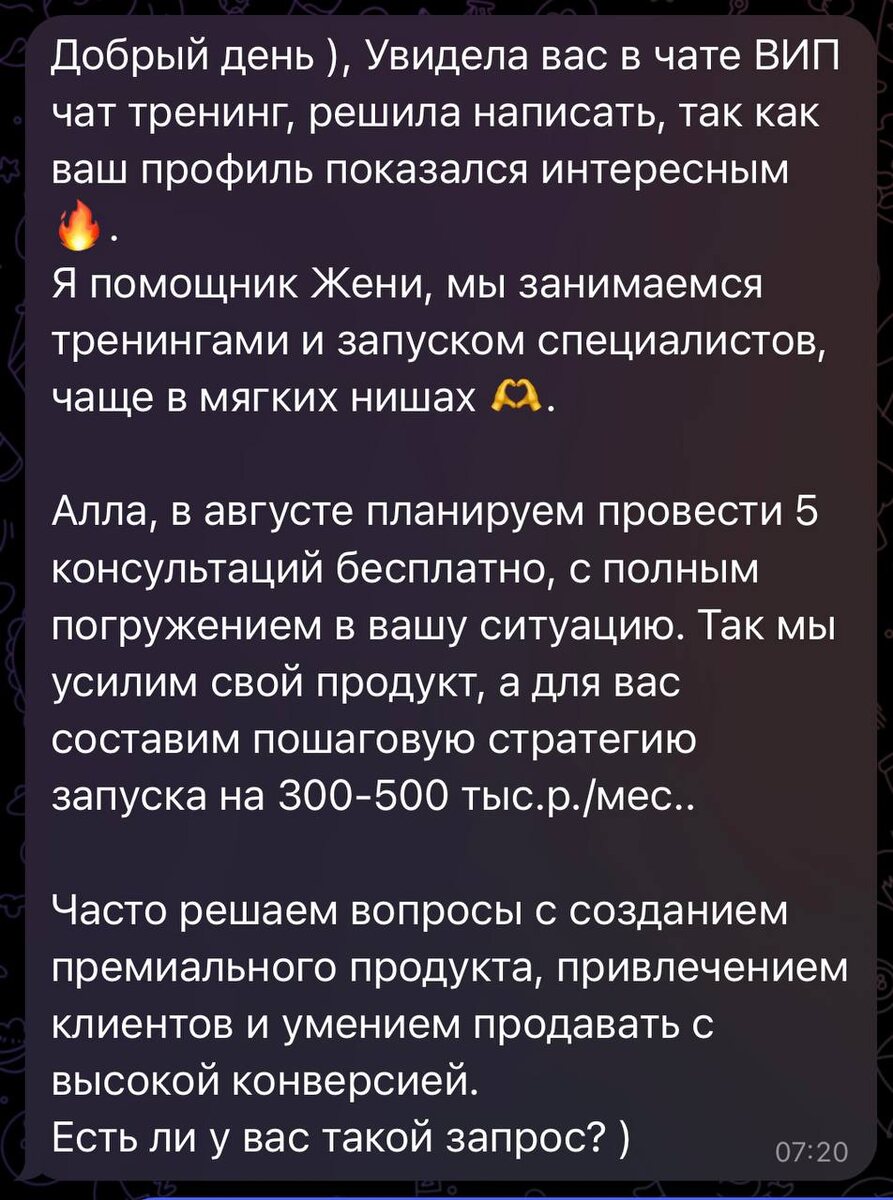 Рассылки, в целом, единственный способ сделать продажи тем, у кого нет никак активов в виде своей базы и соцсетей и нет бюджета на продвижение. И это единственный правильный способ поиска первых клиентов, ибо на старте противопоказано вкладываться в продвижение даже если есть бюджет. Но, вопрос только в том — как это делать? Можно делать также позорно как в этом примере 1. "Добрый день скобка запятая" — вам на столько пофиг, что даже имя не можете добавить и проверить ошибки в тексте?