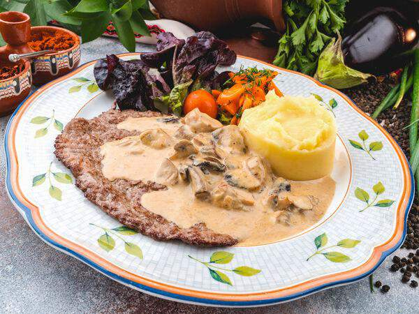 Это сытное и насыщенное блюдо подарит вкусный и уютный ужин, сочетающий мягкость телятины с нежным картофельным пюре и ароматным грибным соусом.