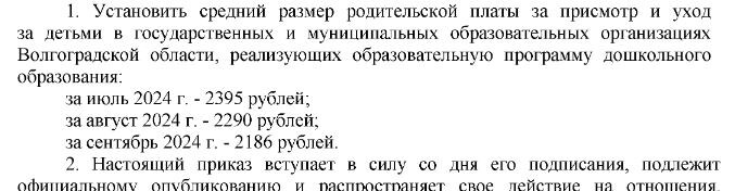 Соответствующий приказ опубликовал областной комитет образования, науки и молодежной политики. На данный момент средний размер платы в государственных и муниципальных дошкольных учреждениях региона составил за июль 2395 рублей, за август — 2290. Сумма несколько уменьшилась в сентябре и составляет 2186 рублей за месяц.