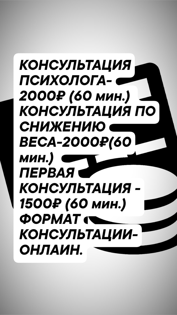 Консультации проходят онлайн (60 мин.) Для записи✍️ необходимо написать одно лишь слово "Консультация" на номер:☎+79282470570 (WhatsApp или Telegram- ) мы подберëм удобное для Вас время🕰 обсудим дополнительные вопросы, если они будут.Напишите МНЕ и я ВАМ обязательно ОТВЕЧУ. Конфиденциальность ГАРАНТИРУЮ💯. КОНСУЛЬТАЦИЯ ПСИХОЛОГА- 2000₽ (60 мин.) КОНСУЛЬТАЦИЯ ПО СНИЖЕНИЮ ВЕСА-2000₽(60 мин.) ПЕРВАЯ КОНСУЛЬТАЦИЯ - 1500₽ (60 мин.) ФОРМАТ КОНСУЛЬТАЦИИ- ОНЛАИН. ССЫЛКА ДЛЯ ЗАПИСИ👇 ССЫЛКА ДЛЯ ЗАПИСИ👆 НЕ РАБОТАЮ С : ❗Зависимости (алкогольные, наркотические, игровые). ❗Дети и подростки. ❗Нарушение сна. Поток наших жизненных событий складывается из "СЕГОДНЯ" и поэтому очень важно именно "СЕГОДНЯ" быть счастливым и наслаждаться моментом🙏.