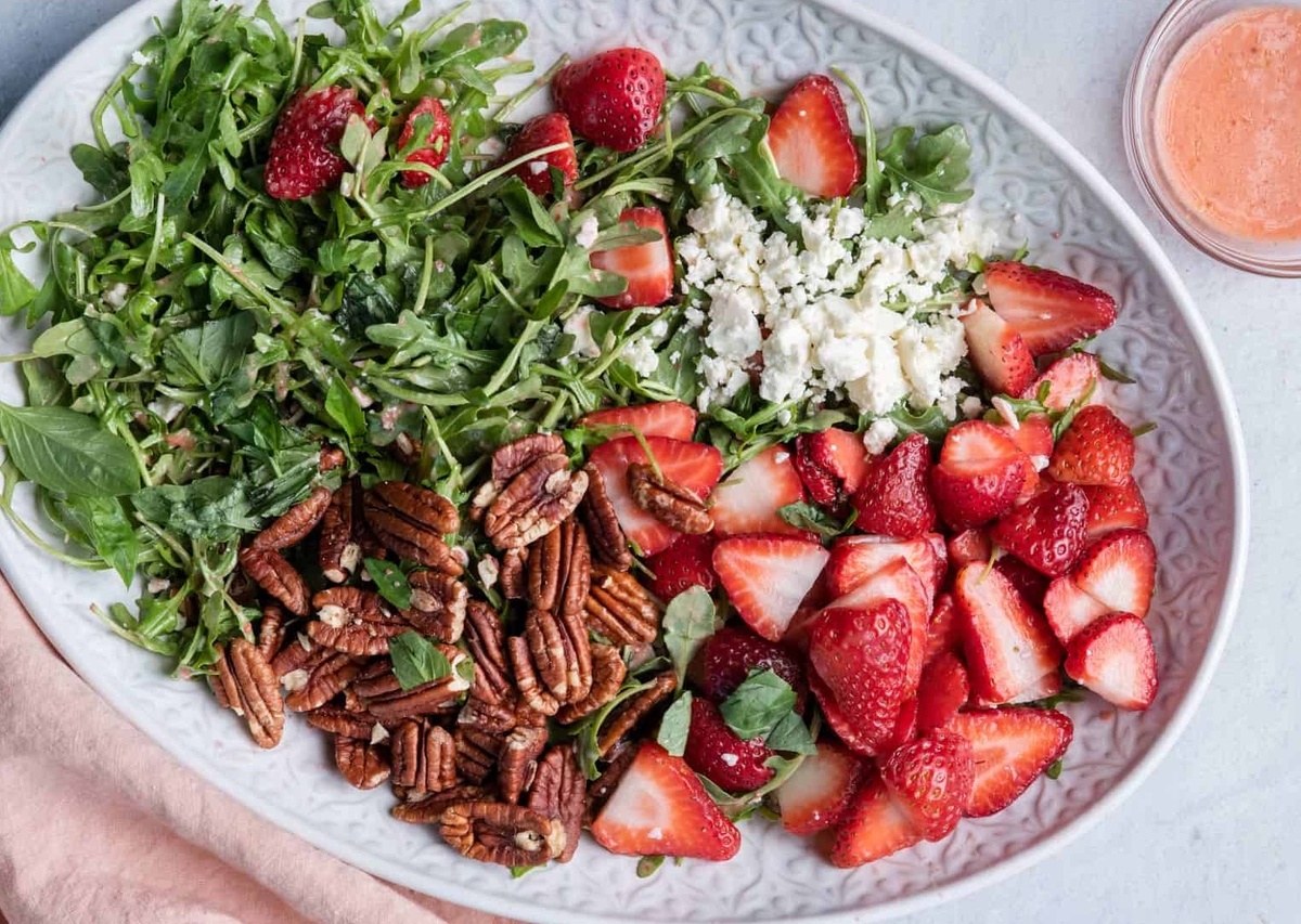 Супер простой салат из клубники и рукколы с хрустящими пеканами, соленой фетой и сладкой клубникой, заправленный клубничным соусом. Кладезь витаминов в тарелке. То, что нужно, чтобы напитать свой организм перед наступлением холодов.