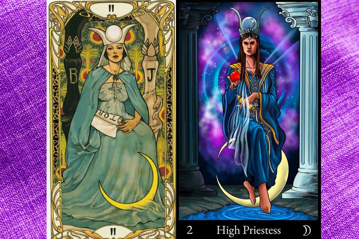 Старший Аркан Верховная Жрица в классической Колоде находится ровно посередине между светлой и тёмной колоннами. На фоне занавеса изображены гранаты. Как известно, в символах и деталях Таро нет ненужного и второстепенного, поэтому давайте посмотрим, какую же информацию несут в себе эти фрукты, о чём же они могут нам рассказать. Есть одно из мнений, что сама Верховная Жрица и окружающие её символы дают отсылку к греческой мифологии, точнее, к мифу о Персефоне. Кстати, часто можно встретить другое имя этой богини – Кора (буквальное значение «дева»). Согласно легенде, Персефона, находясь в царстве Аида, съела несколько зёрен граната, после чего стала частью подземного мира и по совместительству его королевой. В конечном итоге Персефоне можно было покидать царство Аида на полгода, вторую же половину она должна проводить рядом с ним. Ежегодное путешествие Персефоны в подземный мир похоже на путешествие Верховной Жрицы за завесу и в бессознательное, в свой подземный/внутренний мир. Если взят